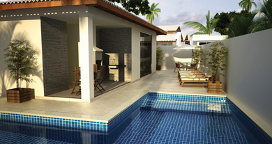 Área de laser com salão de festas e piscina
