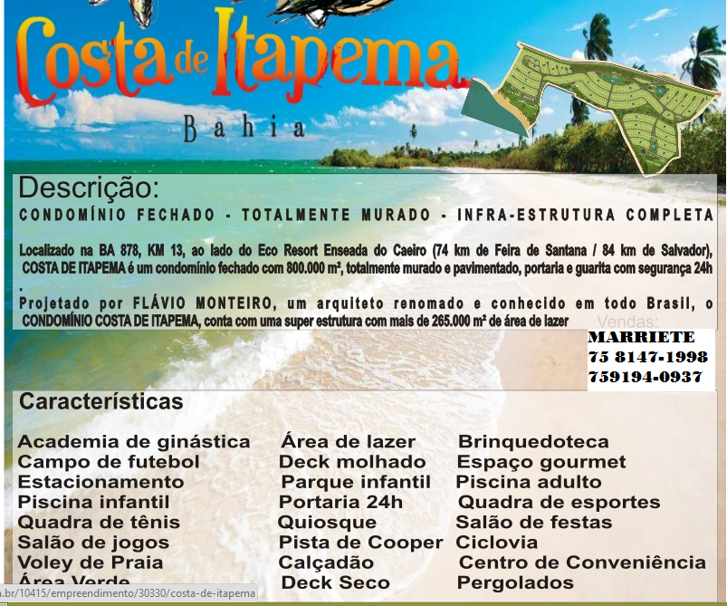 Projetado por Flávio monteiro, um arquiteto renomado e conhecido em todo Brasil, o Condomínio Costa de Itapema conta com uma superestrutura com mais de 265.000 m² de área de lazer. Lotes com prestações mensais a partir de R$ 458,17 financiado diretamente pela construtora, sem burocracia. Com lotes a partir de 302m², praia exclusiva e infraestrutura completa.
